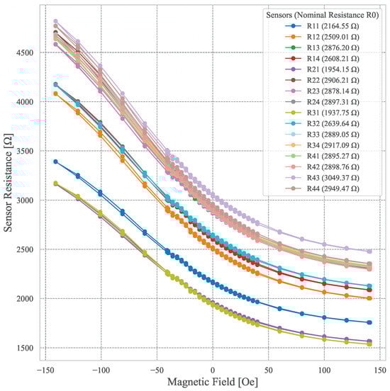 Plot of the resistance across every sensor when an external magnetic field was applied, ranging from −140 to 140 Oe. The nominal resistance values for H = 0 are also shown.