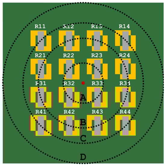 Matrix notation was used to identify each sensor; for example, sensor represents the first sensor in the first column, positioned in the top left corner. The PCBs’ layout and their details are shown in Figure 2a and Figure 2b, respectively. The separation between adjacent sensors is 4.5 mm.