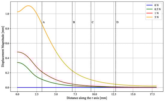 Plot of the displacement magnitude, in , of the elastomeric surface across its surface, with respect to its resting position when different forces are applied by the indenting tip.