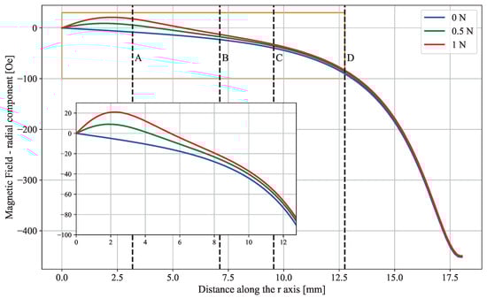 The next stage in the simulation model consisted in modeling the influence of the elastomer magnetic field on the sensor matrix, both before and after a deformation. Only the radial component of the magnetic field, , is relevant to this analysis. The axial component, , is not sensed by the TMR chip, and the tangential component, , is comparatively negligible.