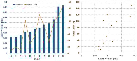A Drifton 2000-D controlled dispenser was used at 0.4 MPa to cover 12 separate bond-wired sensor dies with known but distinct volumes of epoxy. The mechanical robustness of the protection was evaluated upon applied forces to determine the breaking point versus protection thickness. These results are shown and discussed in Section 3.2. As a result of these tests, the device was encapsulated with an epoxy volume of 0.11 mL per chip, providing a balanced compromise between device sturdiness and minimal epoxy use.