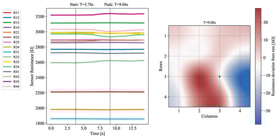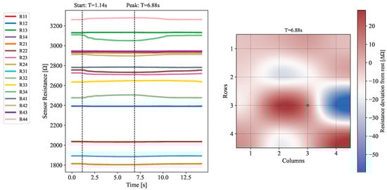 The fully assembled device (see Figure 6) comprises the 4 × 4 TMR sensor matrix encapsulated in epoxy, buried under a 3 mm layer of Ecoflex-based MRE. Initial testing was performed, following the same procedure as the sensor characterization, confirming the proper operation of each sensor. The sensor matrix was measured, and each sensor resistance shows a linear dependence on the magnetic field. These results, shown in Figure 7, confirmed the functionality of the integrated system and set the stage for further experimental data collection under applied forces.