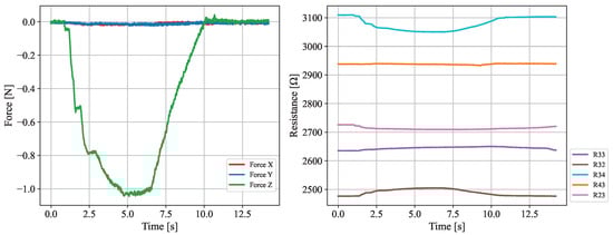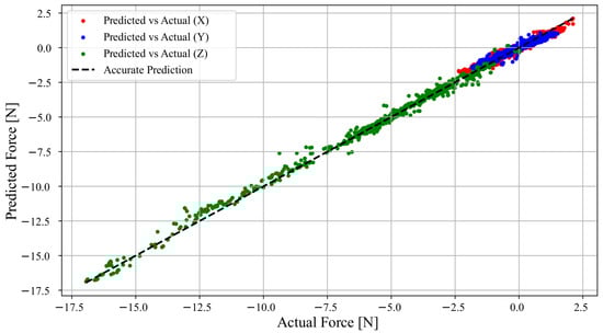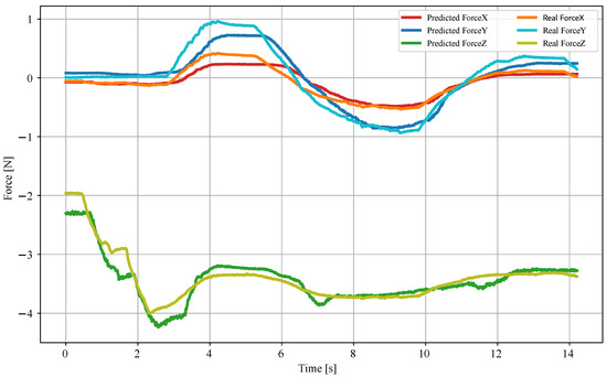 The accuracy of the force-sensitive MLP, described in Section 2.3.2, was evaluated using the 10% of the data that did not enter the training set. In this dataset, shown in Figure 19, the model exhibited a coefficient of determination R2 = 0.9624, MSE of 0.0187 N2, and a mean absolute error (MAE) of 0.0843 N between the predictions and the actual values. Additionally, the model was applied to other independent sets, exhibiting a minimum MAE of 0.07 N and a maximum of 0.17 N. Figure 20 shows one of these analyses. Overall, the results indicate that the device can accurately quantify forces applied in three dimensions, making it reliable for tactile sensing applications.