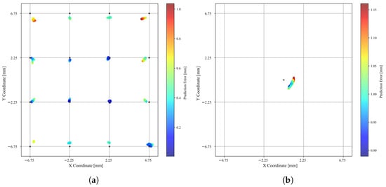 The test set was used once again to make inferences about the accuracy of the model. As one can see in Figure 21a, it was fairly accurate in the predictions of the test set, yielding an MSE of 0.1017 mm2, = 0.9958, and an MAE of 0.2552 mm. When predictions are mapped to the nearest of the 16 tested locations, the accuracy reaches 100%; i.e., the device consistently distinguishes between 16 distinct points across an area of 25.5 mm × 25 mm. The maximum and minimum registered euclidean distances between the real values and the predictions were 1.0692 and 0.0018 mm, respectively. The ability of the model to predict locations outside its training scope was tested as well. For that purpose, the indenting tip exerted force on the center of the elastomeric membrane, as seen in Figure 15b. The resulting prediction, seen in Figure 21b, reveals a minimum euclidean distance to the actual force application point of 0.8894 mm and a maximum of 1.1609 mm, and an MAE = 0.6303 mm. Overall, it performed well on predicting locations of an applied stimulus and was also capable of extrapolating for unrepresented ones.