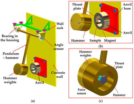 The pendulum axis was supported on the rolling bearings placed in cases connected with the rack fixed to the vertical wall. On the pendulum axis, we placed an angle sensor (WMU45SK–WObit, Pniewy, Poland), which made it possible to determine the impact velocity measuring the arm deflection from the perpendicular. Figure 3b presents the anvil of the hollow cylinder shape fixed in the holder built into a vertical concrete wall. The force of hammer impact on the sample was measured by means of the piezoelectric sensor—Endevco model 2311–100 (Meggitt Sensing Systems, Irvine, CA, USA) of a sensitivity of 24.23 mV∙N−1 in the measurement range of ±220 N (Figure 3c).