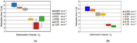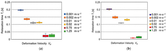Figure 5 presents the values of relaxation time T1. The largest average values in the range from 0.197 s to 0.111 s (at the boundary values: 0.208–0.105 s) were achieved by T1 at the small deformation velocities 0.001–0.02 m·s−1 and the smallest ones in the range from 0.0252 s to 0.0228 s (the boundary values: 0.04–0.016 s) at the large values 0.75 m·s−1 and 1.25 m·s−1.