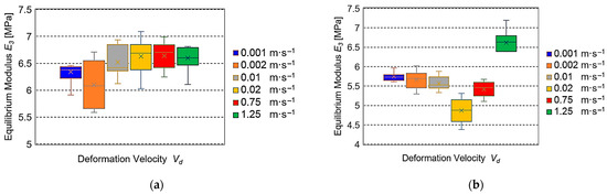 The results of the experiments conducted for the assumed values of deformation velocity Vd are presented in Figure 5, Figure 6, Figure 7 and Figure 8. The cellular flow of gases with the load is the fastest. Therefore, it is expressed by a time constant of the seconds fraction value—relaxation time T1 (η1·E1−1). The specification of relaxation times T1 for different deformation velocities Vd presented in Figure 5a,b indicated their large drops observed for both fresh and stored roots. This trend is consistent with the results of investigations presented in the papers concerning apples, pears, and potatoes [37,38], as well as for biodegradable films [39]. It should be emphasized that the relaxation times T1 obtained in the range from 0.001 m·s−1 to 0.02 ms−1 were 10–30 times higher than those registered for Vd = 0.75 m·s−1 and 1.25 m·s−1. The motion of intercellular fluids in the Maxwell model can present the relaxation time T2 (η2·E2−1). Their flow is slower than that of gases, so the obtained values T2 are expressed in seconds. Figure 6a presents a huge drop of T2 in the range of average values at quasi-static deformation velocities Vd = 0.001–0.02 m·s−1 for fresh beets. In the case of velocities from 0.75 m·s−1 and 1.25 ms−1 for the stored roots (Figure 6b), the drop was also observed, but its range of average values was smaller. Similar behavior of loaded beet tissue was observed at greater deformation velocities Vd, being 0.75 m·s−1 and 1.25 m·s−1 for the 5-day-old roots. It should be stressed that the average relaxation times T2 were over 3.5 times smaller than those registered for the quasi-static velocities. The other parameter describing the courses of viscoelastic material stress relaxation is the equilibrium modulus E3, which in the generalized Maxwell model can represent an element of a very long time constant (stable) that is the value after stabilization of stress (force). In this paper, the values E3, depending on the deformation velocity, are presented in Figure 7. For fresh roots, insignificant changes E3 were found for the quasi-static deformation velocities in the range 0.001–0.02 m·s−1. However, in the velocity range 0.75 m·s−1 and 1.25 m·s−1, the values E3 were comparable (Figure 7a). They differed significantly from the results obtained, e.g., for apples, for which at large deformation velocities, the values of the equilibrium modulus E3 were much smaller than those observed for the quasi-static deformation velocities [38,40]. However, in the case of sugar beets, it can be suggested that this is the effect of a small content of gases in the tissue structure. This results in small deformation formed during annihilation of the spaces filed with gases between the beet cells, which can arise at the loads with the deformation velocities in the range m·s−1. Moreover, it should be stated that at the assumed values for the experiment deformation value and deformation velocity, a not very large destruction of sample structure due to the action of impact load can take place. In the case of maximal reaction forces of the sample Fp, the smallest values were found for low deformation velocities for both fresh and five-day-old roots. For the higher velocities, a 3–4 times increase in Fp took place for fresh beets, which was observed also for 5-day-old roots. This trend was also observed for 5-day-old roots. This increase was the result of over 60 times larger impact velocity. The differences in the Fp values took place after storage and indicated a decrease in the average reaction force in the range 9–19% for the velocity 0.001–0.02 m·s−1 and 6–8% for Vd = 0.75 m·s−1 and 1.25 m·s−1. The decrease in average values of reaction forces observed for all velocities for the 5-day-old roots was due to a decrease in water amount in the beet external layers (softening of the tissue) after the storage.
