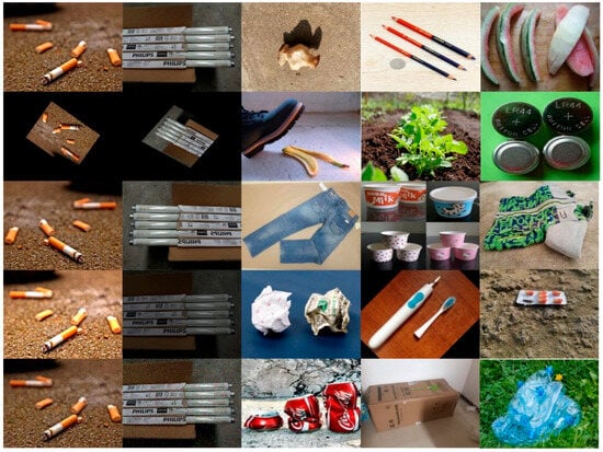 - Majchrowska, S.; Mikołajczyk, A.; Ferlin, M.; Klawikowska, Z.; Plantykow, M.A.; Kwasigroch, A.; Majek, K. Deep Learning-Based Waste Detection in Natural and Urban Environments. Waste Manag. 2022, 138, 274–284. [Google Scholar] [CrossRef]