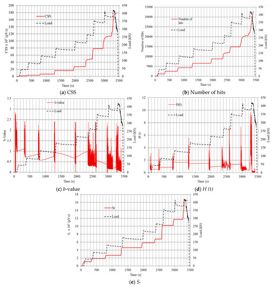 AE parameters and load vs. time curves for PRECC beam sensor 2: (a) CSS; (b) number of hits; (c) b-value; (d) H (t); (e) Sr.