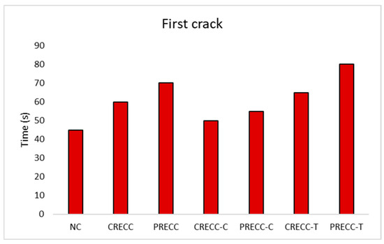 Figure 4 shows the time for the first crack for all tested beams. For the control beams (NC, CRECC, and PRECC), it is evident that the RECC beams showed a delayed first crack when compared to the NC beam (45 s). The CRECC beam displayed the first crack at about 60 s, while the PRECC beam showed the first crack at about 70 s. This could be due to the higher tensile strength of the RECC beams (Table 2). In terms of AE parameters, both CRECC and PRECC beams resulted in an average number of hits of 302 and 344 hits, average CSS values of 0.42 and 0.48 pV.s, and average b-values of 1.19 and 1.59, respectively, at the first crack detection (Table 5). On the other hand, the NC beam showed an average number of hits of 171.3, an average CSS value of 0.15 pV.s, and an average b-value of 2 (at the first crack). Referring to beams repaired in the compression zone (CRECC-C and PRECC-C), the time of the first crack in those beams was very comparable to the NC beam. CRECC-C and PRECC-C beams exhibited the first crack at 50 s and 55 s, respectively. The comparable time of the initiation of the first crack in beams repaired in the compression zone and the NC beam is related to the fact that the first crack occurred in the tension zone of the beam (bottom part), which is made with the NC mixture in both the fully cast NC beam or beams repaired in the compression zone. The slight increase in the time of the first crack in CRECC-C and PRECC-C beams compared to the NC beam (55 s compared to 50 s) is maybe due to the higher compression strain of CRECC-C and PRECC-C compared to NC [1]. With regard to beams repaired in the tension zone, both CRECC-T and PRECC-T showed a more delayed first crack (65 s and 80 s, respectively) due to the higher tensile strength (when compared to the NC beam) [1]. The CRECC-C beam was accompanied by an average number of hits of 251.3 hits, an average CSS value of 1.79 pV.s, and an average b-value of 1.53, while PRECC-C was accompanied by an average number of hits of 273.6 hits, an average CSS value of 3.3 pV.s, and an average b-value of 1.15 at the time of first crack (Table 5). In addition, both CREEC-T and PRECC-T were followed by an average of number of hits of 321.3 and 395.3 hits, average CSS values of 0.85 and 3.47 pV.s, and average b-values of 1.4 and 2.71, respectively, at the time of first crack (Table 5). AE analysis, therefore, has shown efficacy in obtaining the time for the first crack (first change in slope in AE parameter curves) for all tested beams.