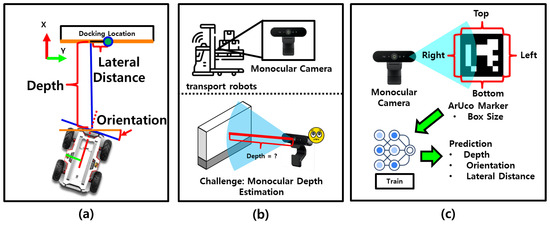 Nevertheless, monocular cameras have a fundamental limitation: they cannot directly measure spatial relationships such as distance, orientation, or the relative position between the robot and the charger. As shown in Figure 1a, successful docking requires accurate information on depth, lateral offset, and relative orientation between the robot and the docking station. However, in cost-sensitive industrial settings where transport robots are equipped only with monocular cameras (Figure 1b), acquiring this information directly is difficult. This limitation hinders precise autonomous docking. One potential solution is to introduce visual cues such as ArUco markers. Figure 1c illustrates the proposed system, which estimates the robot’s relative pose—depth, orientation, and lateral offset—by learning the visual changes between the robot and the docking station using a regression model trained exclusively on monocular image inputs.