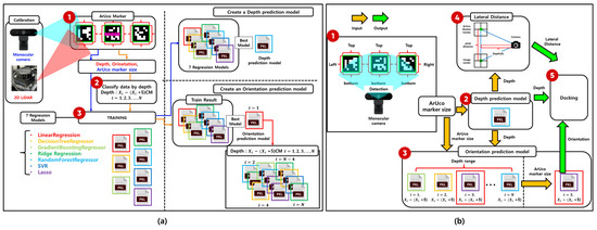 Figure 2b illustrates the real-time inference stage. The ArUco marker is detected using the monocular camera, and its size and shape features are extracted. These features are input into the depth prediction model to estimate the distance between the robot and the marker. Based on the estimated depth, the appropriate orientation prediction model is selected and used to calculate the orientation. Additionally, the estimated depth is used to compute the lateral offset via triangulation. Ultimately, the system obtains three key parameters—depth, orientation, and lateral offset—required for precise docking and proceeds with the docking maneuver accordingly.