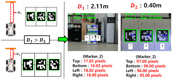 The lateral distance K is computed based on the predicted depth Z and the lateral pixel displacement P between the center of the camera image and the center of ArUco Marker 2. In this study, the pinhole camera model is applied to project the pixel offset into a real-world lateral distance using the back-projection equation shown in Equation (6).