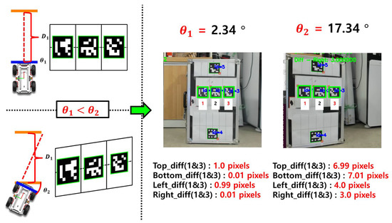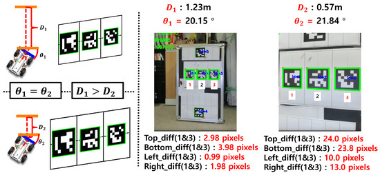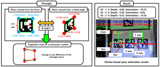 This study proposes a method for indirectly estimating orientation by leveraging the projection distortion characteristics of monocular vision. As shown in Figure 4, the appearance of the ArUco marker in the image is distorted depending on the viewing orientation. By training a regression model on this nonlinear relationship, the system can predict orientation using only the shape information of the marker.