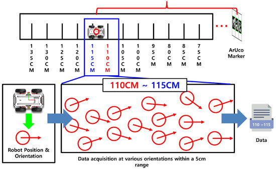 In Figure 2a, synchronized data are collected using both a monocular camera and a 2D LiDAR sensor. The ArUco marker is detected in images captured by the monocular camera, and the 2D LiDAR scan data are projected onto the corresponding marker location to obtain accurate ground-truth values for depth and orientation. These values serve as training labels for the regression models. The monocular camera captures the marker from various distances and orientations, collecting data that reflect changes in the apparent size and shape of the marker. By combining visual features with spatial measurements, the system learns the precise relationship between the marker’s appearance and its spatial attributes—depth and orientation.