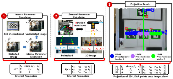 As shown in Figure 7, the intrinsic parameters are computed using images of an checkerboard pattern captured from various positions. The extrinsic parameters (rotation and translation) are estimated using OpenCV’s SolvePnP algorithm when both the monocular camera and LiDAR observe the same object. Using the computed intrinsic matrix K and extrinsic parameters , the 3D coordinates from the LiDAR are projected onto the 2D image coordinates of the monocular camera as follows:
