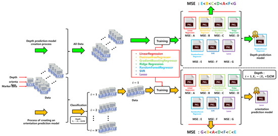 Seven regression algorithms are employed for model training: linear regression, decision tree regressor, gradient boosting regressor, ridge regression, random forest regressor, support vector regressor (SVR), and lasso regression [10,11,12,13,14,15,16]. The model demonstrating the best performance is selected based on the mean squared error (MSE) and prediction stability on the validation dataset. A single regressor is used for depth prediction, while a multi-regressor structure is adopted for orientation prediction, with specific regressors selected according to distance ranges to address geometric distortion caused by varying viewpoints.