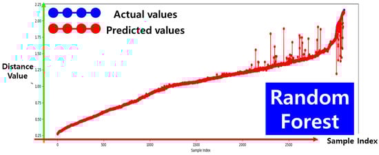 As shown in Figure 9, the performance evaluation of the depth prediction models indicates that the random forest regressor yields the best results. Specifically, this model achieves a mean squared error (MSE) of 0.0009 and a coefficient of determination () of 0.9937. These values indicate that the prediction error is extremely low, demonstrating a high level of accuracy in depth estimation.