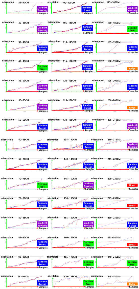 As a result, a total of 315 models are trained—one for depth prediction and 314 for orientation prediction (45 segments × 7 models)—and the best-performing model is selected for each segment. This approach enables the system to maintain high generalization performance and prediction accuracy across a wide range of distances.
