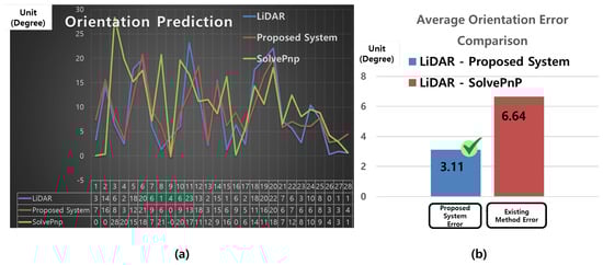 The mean orientation error refers to the average absolute difference between the predicted and ground-truth orientation values for each sample. Here, denotes the ground-truth orientation measured by LiDAR at the i-th sample, is the predicted orientation from the proposed system, and is the orientation estimated by the SolvePnP method. N denotes the total number of samples. The mean orientation errors for the proposed system and SolvePnP are defined in Equations (4) and (5), respectively.