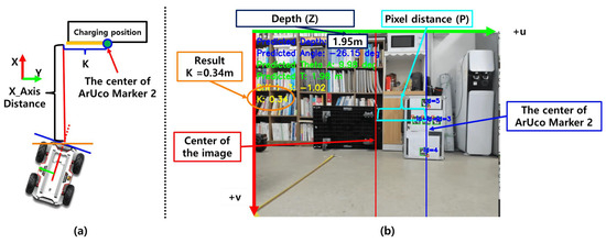 In addition to depth and orientation estimation, accurately calculating the lateral distance is essential for precise docking alignment. In this study, ArUco Marker 2 is placed at the center of the docking position. As shown in Figure 14a, the lateral distance refers to the displacement along the y-axis of the robot’s coordinate frame, from the robot to the docking point, while the x-axis represents depth. In the diagram, the lateral distance is denoted by K, which quantifies how far the marker center deviates to the left or right from the robot’s forward direction.