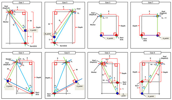 The proposed system performs docking by first estimating the relative position between the robot and the docking station using spatial information inferred from a regression model trained on ArUco markers. Based on the estimated position and orientation, one of eight predefined docking cases—illustrated in Figure 15—is selected to guide the docking maneuver.