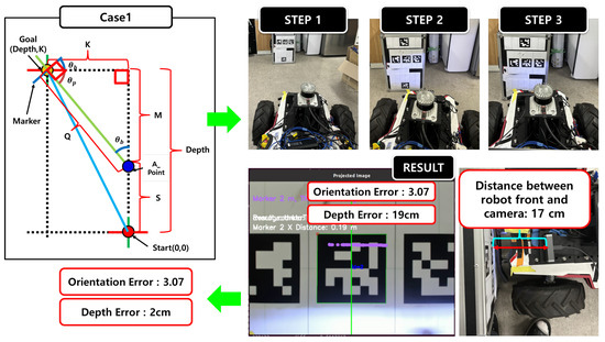 In the experiment, docking performance was evaluated using Case 1, as illustrated in Figure 16. In Step 1, the proposed model estimated the distance and orientation between the robot and the docking point, where the ideal condition corresponds to a distance error of 0 cm and an orientation error of 0°. In Step 2, the robot rotated by the predicted orientation to align perpendicularly with the docking target. In Step 3, proportional control (P-control) was applied to finely adjust the robot’s position and complete the docking maneuver.