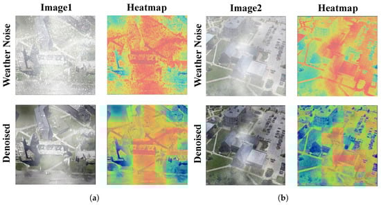 (a,b) each compare the heatmaps of noisy images from University160K-WX and their denoised counterparts.