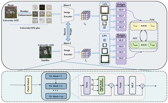 To address the challenges, this paper proposes a twin network model, AGEN, which fully leverages the advantages of DINOv2 [24], especially its strong global feature extraction capabilities. However, DINOv2 exhibits certain limitations in capturing fine-grained features. To overcome this, the Local Pattern Network (LPN) [25] is creatively integrated, effectively compensating for DINOv2’s shortcomings in fine-grained feature extraction. Additionally, we innovatively propose the fuzzy PID control-based Adaptive Error Control (AEC) module. The AEC module dynamically adjusts loss weights by incorporating historical error information and its temporal evolution, aiming to mitigate training instability caused by extreme weather conditions. By enabling stage-aware optimization throughout the training process, the AEC module enhances the model’s robustness and convergence under severe environmental variations. Furthermore, we employ a data enhancement algorithm for better model training, which applies nine different weather conditions to the drone images in the University-1652 dataset [26]. Our main contributions are summarized as follows.