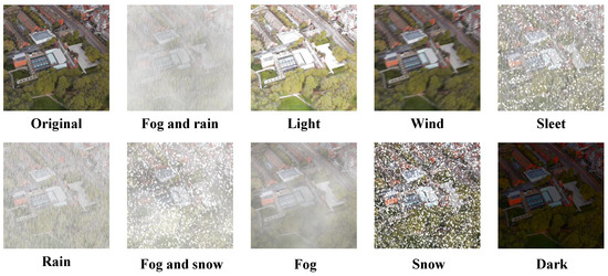 This section outlines the process and rationale for creating our augmented dataset, University1652-plus. In order to enhance the robustness of cross-view geo-localization models under adverse weather conditions, the University1652-plus dataset is developed by extensively expanding the original University-1652 dataset. Specifically, nine distinct weather conditions are selected to simulate various challenging environments for drone-view images, including dark, rain, fog, snow, fog and rain, fog and snow, sleet, light, and wind, as shown in Figure 3. These selections aim to cover a wide range of weather scenarios that could affect drone images.