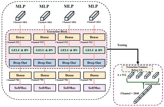 where y is the ground-truth label. This allows each branch’s classifier to focus on specific local features, improving classification accuracy and fine-grained feature interpretation. During training, classification results from each branch are integrated to optimize overall model performance. During inference, classification results from each branch are stacked to provide detailed outputs, as illustrated in Figure 4.