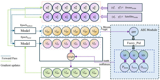 The overall training process, as illustrated in Figure 5, demonstrates how historical information and the Adaptive Error Control (AEC) mechanism optimize parameters using six data samples. The dataset consists of drone-view and satellite-view image samples, denoted as and , respectively, to address multi-view image-matching tasks. After each sample undergoes forward propagation, the cross-entropy loss function is used to calculate the error between the model’s predictions and the ground truth labels, defined as Equation (16).