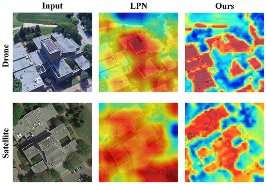 Due to great spatial and temporal differences, e.g., varying angles and fields of view, between satellite and ground-view images, the matching task is very challenging in dealing with significant disparities in scale, perspective, and background [7,8]. On the other side, with the continuous development of drone technology, drones have become more convenient and cost-effective for image acquisition in recent years. Compared with traditional ground-based imagery, the angular difference between the drone view and satellite view is smaller, and there are fewer obstacles, such as trees and surrounding environments, in the images captured by drones. These advantages make drone-view images more suitable for cross-view matching tasks [9,10].
