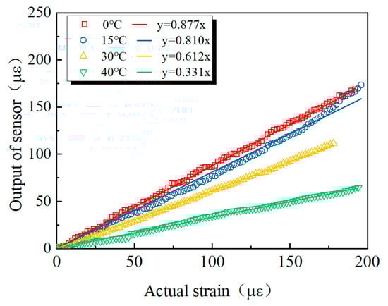 Figure 2 shows the comparison between the strain measured by the buried strain sensor and the actual strain under all temperature conditions. A clear linear relationship exists between the two, with the fitting performed using a line passing through the origin. However, the slope of the fitted line is consistently less than 1, indicating that the buried strain sensor systematically underestimates the actual deformation. Notably, the phenomena between the measured strain and the actual strain becomes more pronounced as the temperature increases. The observed differences may be attributed to the contrasting thermal behaviors of the two materials: the modulus of the asphalt mixture decreases with increasing temperature [36,37], while that of the buried strain sensor remains nearly constant. Consequently, as temperature rises, the ratio of the sensor modulus to that of the asphalt mixture increases, resulting in relatively smaller deformation of the sensor and thus a progressive underestimation of the measured strain.