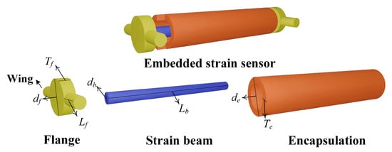 Figure 3 illustrates the structural schematic of the buried strain sensor. A typical sensing element consists of two flanges and a central elastic strain beam. To prevent interfacial debonding between the flanges and the surrounding asphalt mixture under cyclic loading, two lateral wings are integrated on both sides of the flanges along the vertical measurement direction. These wings enhance the mechanical bonding between the flanges and the asphalt matrix. However, the addition of flanges may lead to stress concentration, particularly when the strain sensor exhibits poor mechanical compatibility with the deformation of the asphalt mixture. The relative displacement between the two flanges induces tensile or compressive deformation in the elastic strain beam. Transition elements, such as fiber Bragg gratings or resistive strain gauges, are bonded to the elastic strain beam to monitor its deformation. As a result, the buried strain sensor can effectively measure the average strain within the asphalt mixture. To ensure long-term durability under traffic loads and adverse environmental conditions, the sensing element and the transition element are enclosed within a protective housing.