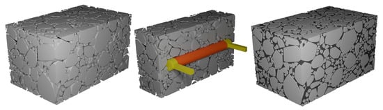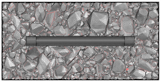 To investigate the influence of asphalt mixture heterogeneity on the measurement performance of buried strain sensors, this study employed a mesoscale structural reconstruction method previously developed by the authors [38]. This method is based on rigid body dynamics to simulate the motion and interaction of aggregate particles. A digital aggregate library was first established by performing three-dimensional scans of actual aggregate particles. By using the digital aggregates in the library together with a rigid-body dynamics algorithm, a stable aggregate skeleton of the asphalt mixture can be generated. This method enables a one-to-one reconstruction of the mesoscale structure of asphalt mixtures. When incorporating the buried strain sensor model, the sensor geometry was predefined at a designated location to avoid spatial overlap with the aggregates. Considering computational limitations, the asphalt mixture specimen used in this study is set to dimensions of 14 cm × 8 cm × 8 cm. Figure 4 illustrates the heterogeneous structure of the asphalt mixture with a buried strain sensor. The sensor dimensions in this study are based on the AS-200 model, with a diameter of 10 mm, a flange length of 10 mm, and a total length of 80 mm. The gauge length of the sensor is defined by the flange spacing, resulting in a gauge length of 60 mm.