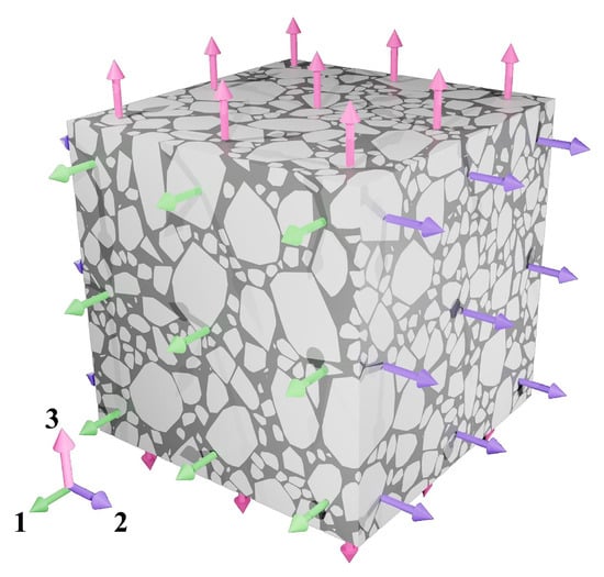 where denotes the effective modulus of the representative volume element in the i-th direction, where and represent the original length and elongation of the representative volume element, respectively. is the volume of the representative volume element, and refers to the normal stress in the i-th direction.