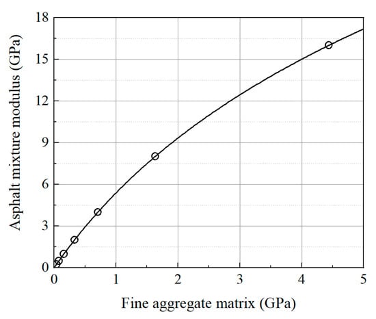 To reduce computational demands while maintaining acceptable accuracy, this study employs an equivalent mechanical approach to approximate the viscoelastic response of the asphalt mixture. The viscoelastic behavior of asphalt mixtures under varying temperatures and loading frequencies is discretized into a series of instantaneous elastic problems using composite material homogenization methods, which is a commonly used approach to reduce computational complexity [39,40]. Specifically, the fine aggregate matrix was modeled as a linear elastic material, and the overall mechanical response of the asphalt mixture was calibrated by adjusting the fine aggregate matrix properties through composite homogenization methods. As illustrated in Figure 6, uniaxial loading is applied along three mutually perpendicular orthogonal directions on representative volume elements of appropriate size. The effective modulus of the asphalt mixture can be determined using Equation (1). The dynamic modulus of the asphalt mixture generally ranges from 0.25 GPa to 16 GPa, depending on temperature and loading frequency. To simulate the behavior of the asphalt mixture under various conditions, eight representative moduli (0.25 GPa, 0.5 GPa, 1 GPa, 2 GPa, 4 GPa, 8 GPa, and 16 GPa) were selected for discrete simulations. Therefore, the modulus of fine aggregate matrix was incremented from 0.01 GPa to 5 GPa in steps of 0.01 GPa for parameter scanning. As shown in Figure 7, the equivalent modulus of the asphalt mixture exhibits a monotonically increasing relationship with the modulus of fine aggregate matrix. Specifically, when the asphalt mixture modulus is 0.25 GPa, 0.5 GPa, 1 GPa, 2 GPa, 4 GPa, 8 GPa, and 16 GPa, the modulus of fine aggregate matrix is 0.039 GPa, 0.078 GPa, 0.160 GPa, 0.331 GPa, 0.708 GPa, 1.634 GPa, and 4.439 GPa, respectively.