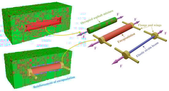 The finite element method has emerged as a powerful tool for modeling mechanical interactions between buried strain sensors and asphalt mixtures. It allows efficient parametric analysis of the sensor geometry, material properties, and boundary conditions without the high cost or logistical constraints associated with physical experimentation [26,27,28]. Han et al. [29] simulated the impact of the interface between buried strain sensors and asphalt mixtures on measurement errors, and proposed an encapsulation design in which a high-modulus core is wrapped with a flexible layer. Similarly, Liu et al. [30] analyzed the secondary calibration coefficients of buried strain sensors in asphalt mixtures at different temperatures through finite element simulations, thereby improving the sensing performance of the sensors. Wang et al. [31] studied the impact of buried sensors on the structural mechanical properties of asphalt pavement and the structural optimization of sensor components. Moreover, finite element methods are widely applied in the simulation of pavement materials and structural mechanics, including rutting, fatigue, crack propagation, and dynamic load responses at both macroscopic and mesoscopic scales [32,33,34]. Therefore, the finite element analysis can provide an effective means to investigate the interaction between buried strain sensors and asphalt mixtures, as well as to optimize and improve the measurement performance of the sensors.