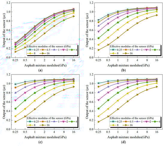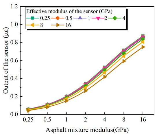 To research the impact of encapsulation modulus on the measurement performance of buried strain sensors, the modulus of the encapsulation material was gradually reduced from 200 GPa to 20, 2, 0.2, and 0.02 GPa. A lower encapsulation modulus weakens the stiffening effect imposed on the surrounding asphalt mixture. Figure 10 presents the sensor responses under different encapsulation modulus conditions. As the encapsulation modulus decreases, the reduction in reinforcement effect is most pronounced for sensors with lower modulus. In contrast, sensors with higher moduli (e.g., 16 GPa) exhibit minimal changes in output under different encapsulation moduli. This trend is primarily attributed to the higher strain sensitivity of low-modulus sensors, which makes them more susceptible to the constraints imposed by the encapsulation. When the encapsulation modulus is sufficiently low (e.g., 0.02 GPa) and the sensor modulus matches that of the asphalt mixture (i.e., 0.25 GPa, 0.5 GPa, 1 GPa, 2 GPa, 4 GPa, 8 GPa, and 16 GPa), the corresponding sensor outputs are 1.0 με, 1.0 με, 1.0 με, 1.0 με, 0.99 με, 0.97 με, and 0.93 με, respectively. These values are close to the actual deformation of the mixture (1 με). Nevertheless, as the sensor modulus increases, the measured strain gradually underestimates the true deformation. This discrepancy may be attributed to the effect of the sensor flange, whose limited thickness induces a non-uniform displacement field along the thickness direction, thereby affecting the overall sensor response. Therefore, minimizing the flange thickness of the buried strain sensor is recommended to improve measurement accuracy.