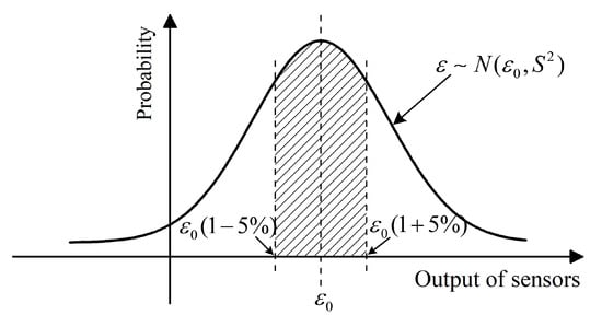 The low-modulus buried strain sensor and free from encapsulation-induced reinforcement effects, has been demonstrated to provide the highest measurement accuracy for asphalt mixtures under varying temperatures and loading frequencies. To further investigate how the heterogeneous meso-structure of asphalt mixtures affects the measurement stability of such sensors, a large number of randomly generated meso-scale asphalt mixture models incorporating low-modulus buried strain sensors were generated. Given the intrinsic randomness of the mixture, the buried strain sensor outputs are assumed to follow a normal distribution , where denotes the expected strain value and represents the standard deviation. A 5% relative error margin was adopted as the threshold for evaluating measurement stability. As illustrated in Figure 11, a schematic diagram is provided to estimate the probability that the sensor outputs fall within ±5% of the target value. To ensure a reliable statistical analysis of output variability, simulations and analyses were conducted on 50 parallel meso-structure samples.