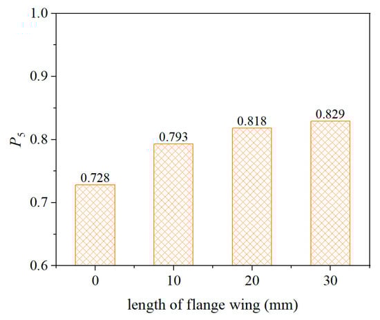 The addition of wings on the flange may also help improve the measurement stability of buried strain sensors. Therefore, the influence of wing length on sensor measurement stability was investigated by introducing wings of 10 mm, 20 mm, and 30 mm in length on the sensor flange. To ensure that the buried strain sensor output accurately reflects the real strain of the mixture, the equivalent modulus of the buried strain sensor was set to 0.25 GPa, and the modulus of the encapsulated was set to 0.02 GPa. As shown in Figure 14, the probability of sensor outputs falling within ±5% of the mean value for different wing lengths is presented. The results indicate that adding wings and increasing their length can enhance the measurement stability of the sensor. However, when the wing length increases from 20 mm to 30 mm, the improvement becomes negligible, indicating that the stabilizing effect of the wings is limited.