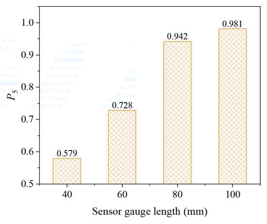 As shown in Figure 15, the sensing stability of the buried strain sensor significantly improves with increasing gauge length. When the gauge length is 40 mm, the probability of the measured value falling within ±5% of the mean is 0.579. This probability sharply increases to 0.728 at a gauge length of 60 mm, and further rises to 0.942 at 80 mm, indicating excellent measurement stability. Therefore, increasing the gauge length of the buried strain sensor is one of the most effective ways to enhance sensor stability. Notably, the gauge length of the sensor is approximately three times the NMAS of the asphalt mixture, which closely aligns with the engineering practice that the asphalt layer thickness should not be less than three times the NMAS. This consistency confirms the reliability of the simulation results.