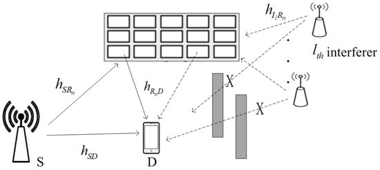 Consider a downlink communication network where a source terminal and a destination terminal communicate with each other via the direct link and an IRS with N reflecting elements (REs) , . It is assumed that the IRS is affected by L independent interfering signals , , as shown in Figure 1. This scenario happens when the IRS is located at the edge of a cellular network. Although the direct link between the interfering signal and the destination is blocked, the interfering signal can be easily reflected by the IRS. , , , and are the channel gains for the -to-IRS, IRS-to-, -to-IRS, and -to- links, respectively, where represents the space of complex-valued matrices. We have , , , and , where , , , and are the channel’s amplitudes, is the phase shift, denotes the lengths of the A-B link, and v is the path loss exponent. We assume that the distance of the IRS- link is much longer than the height of the IRS above the ground. Hence, the height of the IRS is ignored. Hence, , , and for . All fading channels , , , and are assumed to be independent and identically distributed (i.i.d.) and follow the Rayleigh distribution due to the isotropic scattering assumption (e.g., urban or indoor environments with dense obstructions [23,24]).