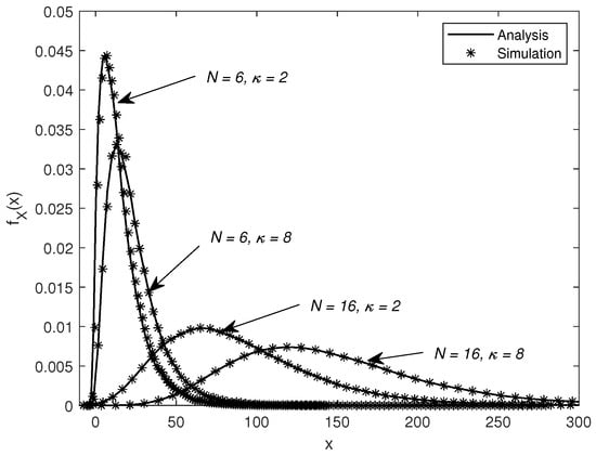 In Figure 2, we compare the PDF of X obtained by the simulation and our approximation in (7). We set dBm. It shows that our approximation matches closely the PDF obtained by the simulation for different cases of N and , which implies that our PDF approximation is accurate. It can be seen that, for the same , the accuracy of the approximation is significantly improved by increasing N from 6 to 16. Similarly, for the same , the accuracy of the approximation can be significantly improved by increasing from 2 to 8. It is observed that the accuracy of the approximation mainly depends on N and , i.e., having an and a . Moreover, it is worth mentioning that the PDF of X shifts to the right when N and are increased, which, in turn, enhances the gain of the -to- composite channel.