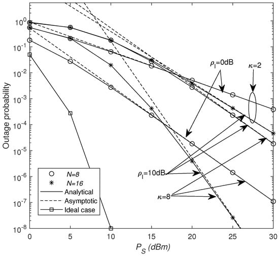 In Figure 3, the outage probability of the considered system is shown for the different values of , N, and . From the figure, one can see that there is a large performance gap between the ideal case (no phase error and interference) and the practical case. As increases (for which the phase shift becomes more accurate), the outage performance can be greatly improved and the system diversity order is also increased. We can see that increasing leads to a severe deterioration of the system performance, but it cannot affect the system diversity order. Particularly, observing the two scenarios where and dB and and dB, in the low-power region, even as N increases, the for dB surpasses that for dB. This is because the impact of reflected interference signals becomes more severe when N grows large. However, in the high-power region, the for dB is lower. This is because the system’s diversity gain is drastically increased by increasing N.