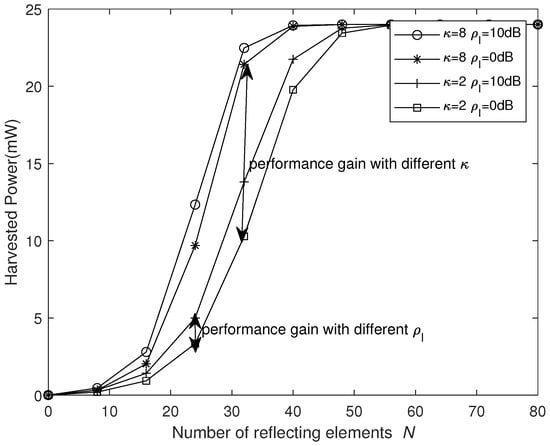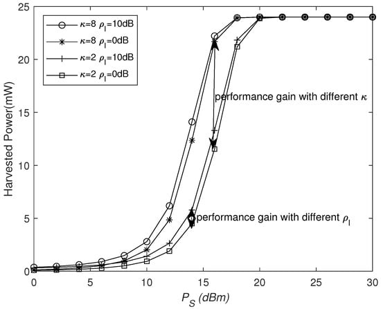 Figure 5 and Figure 6 show the curves of the harvested power under the non-linear EH model versus the number of REs N and the transmitted power with different and values at dBm and , respectively. We can see that, with the increase in N or , the harvested power grows non-linearly. From Figure 5, it can be seen that, when N is small, i.e., , the harvested power is lower and increases relatively slowly. When , the harvested power grows rapidly as N increases, whereas, when N is larger, the harvested power eventually tends to saturate. It is obvious that, as the interference signal power increases, additional energy to the destination can be provided, but only a small amount of energy is harvested. On the other hand, as increases, more power is harvested. From Figure 6, it can be seen that, when is small, i.e., dBm, the harvested power is lower and increases relatively slowly. When 10 dBm dBm, the harvested power grows rapidly as increases, whereas, when is larger, harvested power tends to saturate. Similarly, the harvested energy increases significantly with the increase in , while the impact of interference signals remains relatively small.