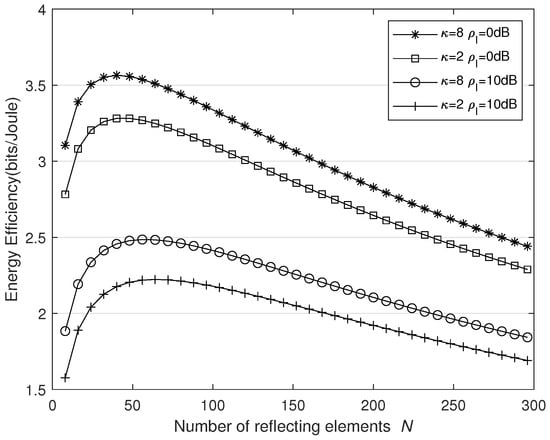 Note that system capacity no longer increases linearly with N. Instead, it is constrained by interference signals and phase error, resulting in a slower growth rate. Moreover, based on (22), it is clear that all the variables exhibit coupling characteristics. Simply increasing N or reducing interference signals is insufficient to improve the energy efficiency of the system. The detailed effects of these factors on the energy efficiency are provided in Section 4.