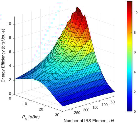 Figure 9 plots the EE versus the number of IRS reflected elements N and the transmit power . For clarity in trend observation, we set and dB. Within the reasonable range of the parameters, we can see that there exists an optimal combination of N and to maximize EE. As can be observed in Figure 6 and Figure 7, EE does not continuously increase linearly with N and . The optimal EE occurs at a moderate N (40–60) and moderate-to-high (15–25 dBm), where IRS-aided beamforming and power gains balance power consumption. This highlights the importance of joint optimization of N and transmit power in practical IRS deployments.