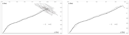 Figure 3. Examples of characteristic AUV trajectories and position estimates. 1— X t , Y t , 2— X ^ t , Y ^ t , on the left t = 0 , , 1000 , on the right t = 57 , , 1000 .